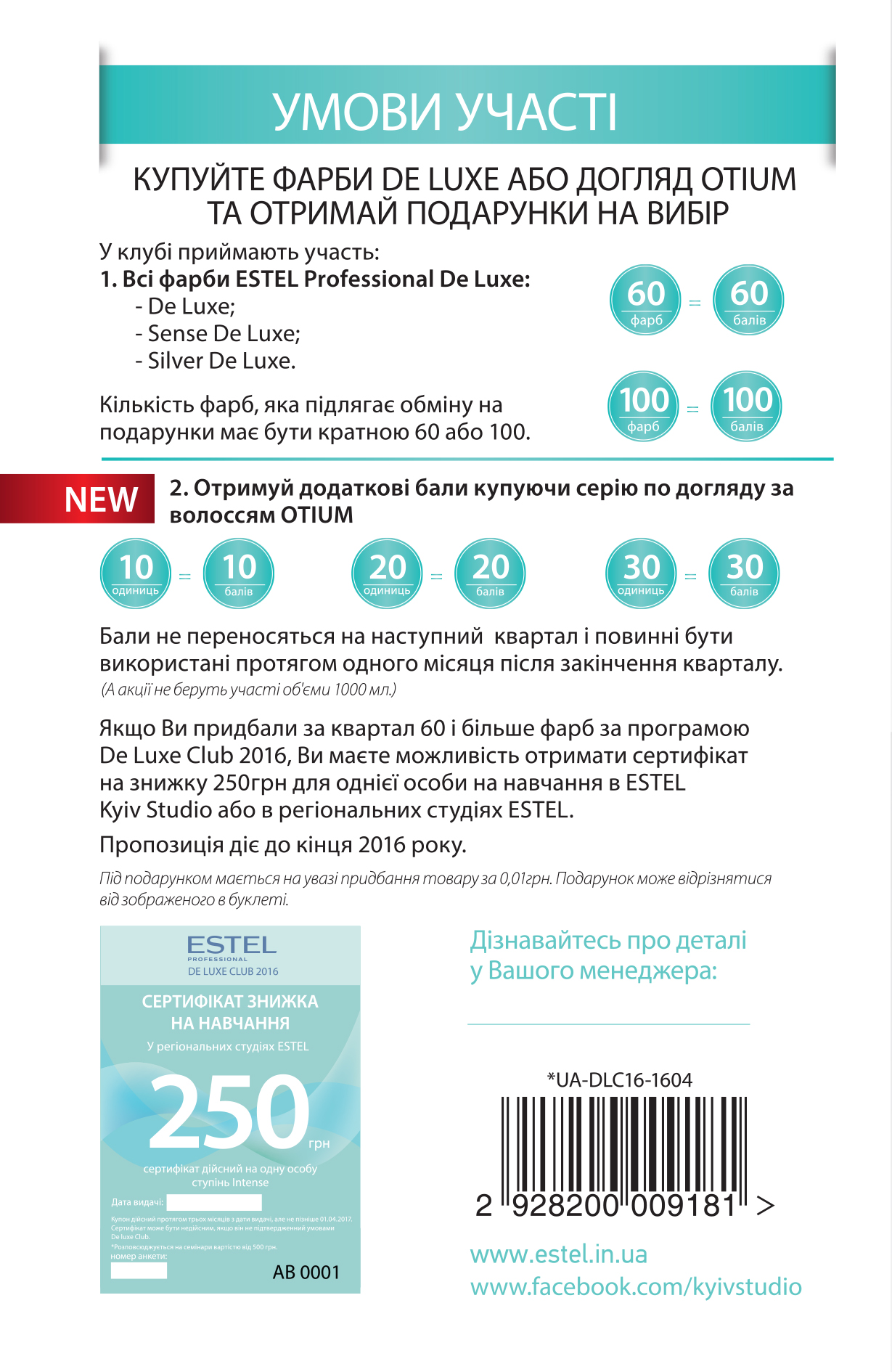 Если Вы приобрели за квартал 60 и более красок по программе De Luxe Club 2016 Вы можете получить сертификат на скидку 250 грн для одного человека на обучение в Estel Kyiv Studio или в региональных студиях Estel.